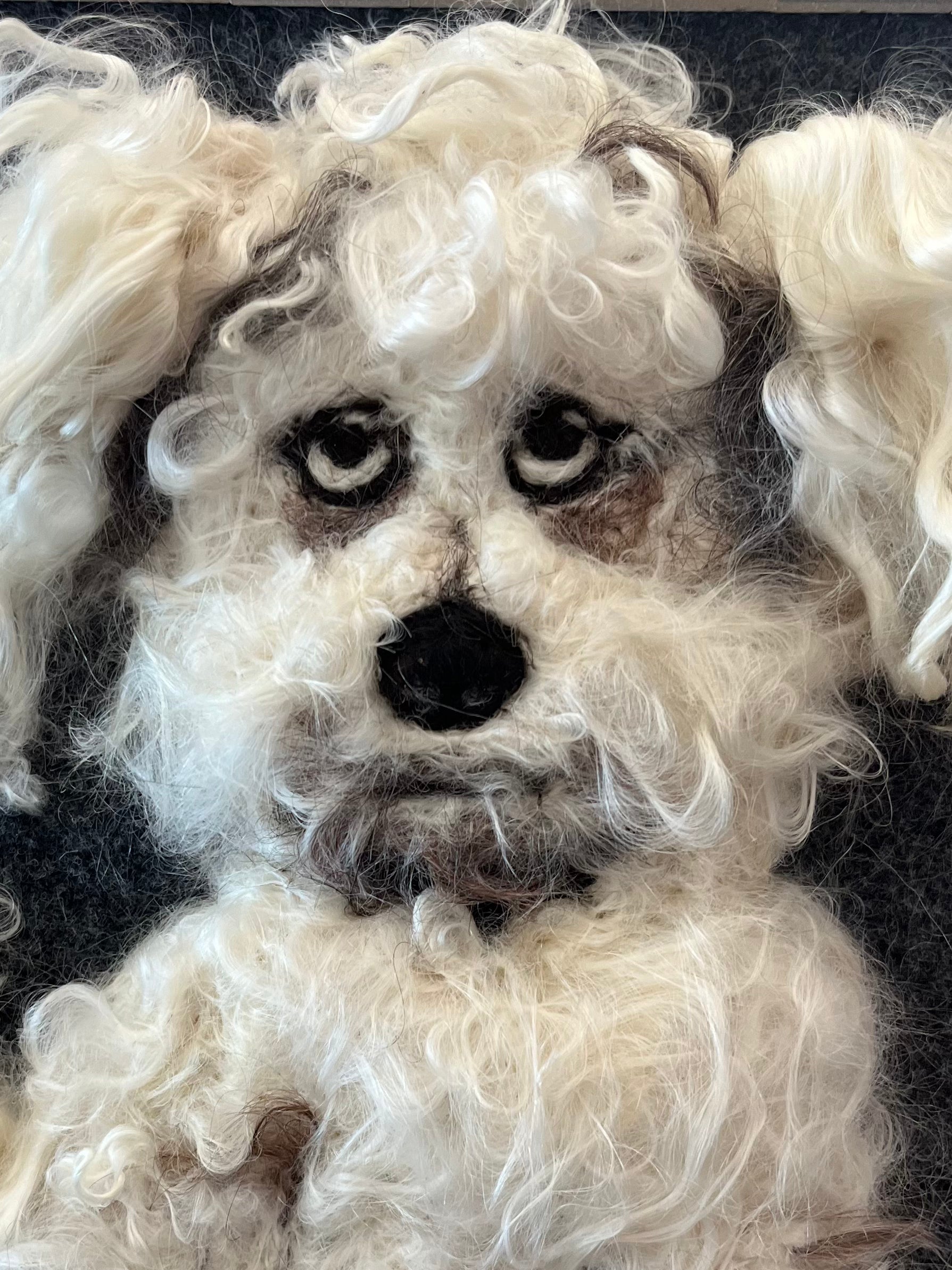 I created this dog portrait by needle felting lustrous white alpaca fiber. The finished product is mounted on a dark grey felt fabric background inside a decorative wood slat frame (there is no glass).