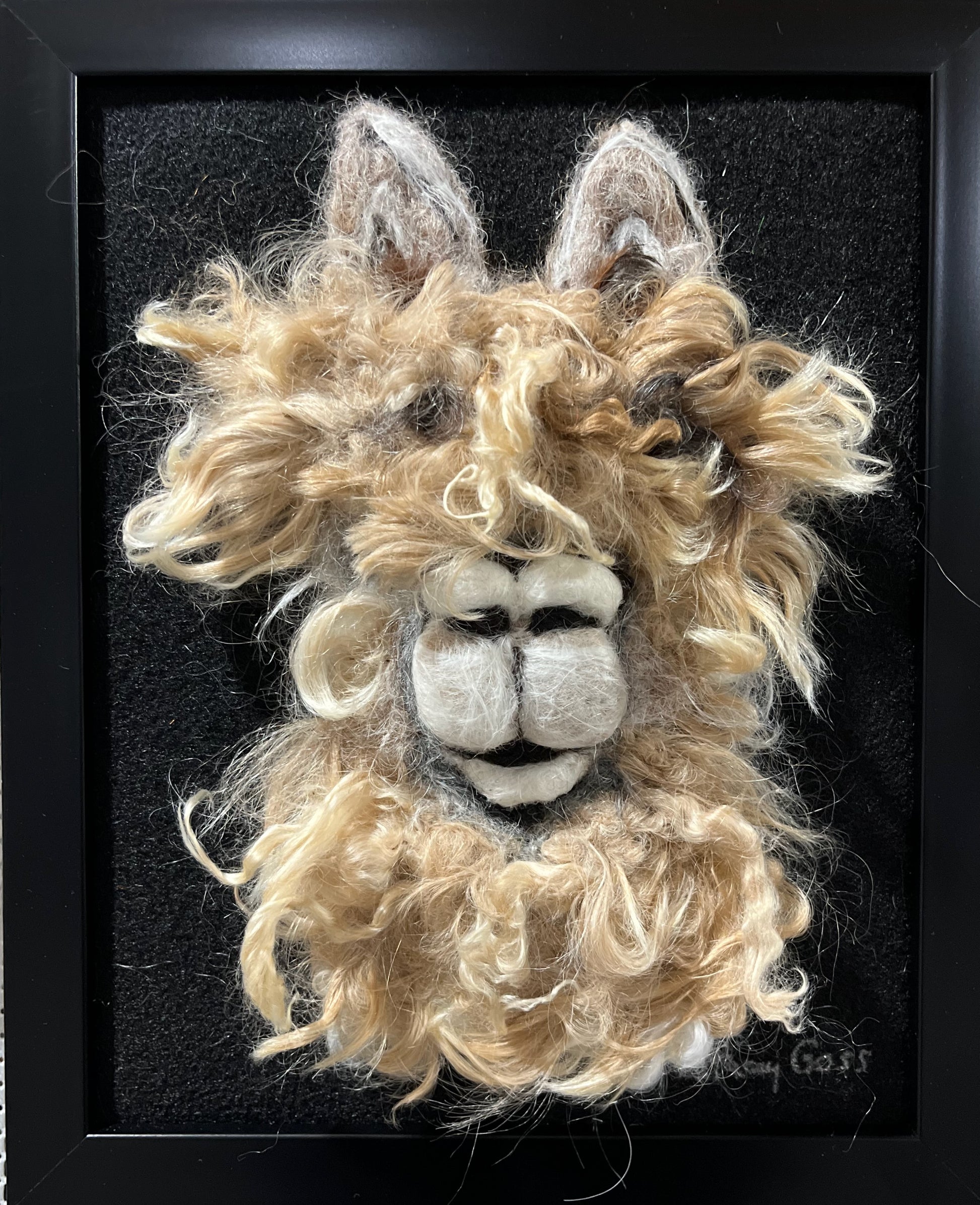 I created this alpaca portrait by needle felting beige fiber with black, white, and grey accents. The finished product is mounted on a black felt fabric background inside a black frame (there is no glass).