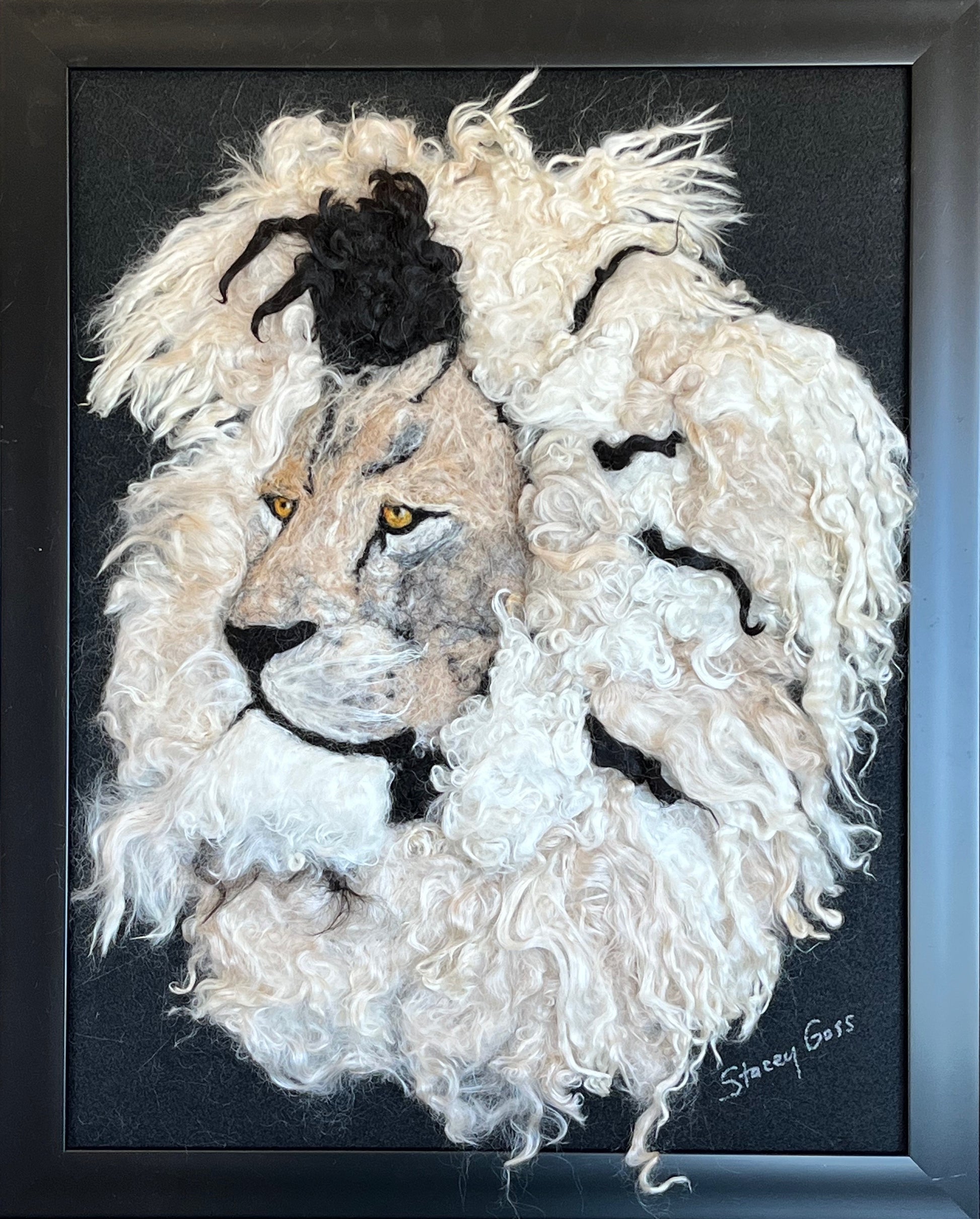 I created this lion portrait by needle felting natural beige and white fiber with black accents (only the eyes are from dyed roving). The lion is mounted on a black felt fabric background inside a black frame (there is no glass).