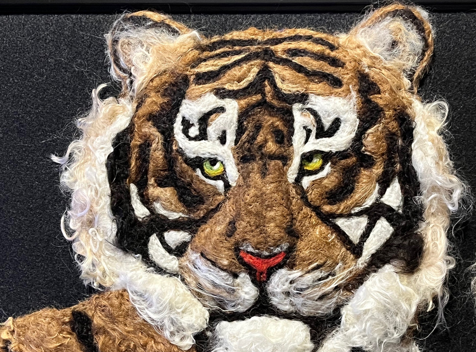 I created this tiger with baby portrait using natural fawn, black, and white fiber (only the eyes are from dyed roving). The artwork is mounted on a black felt fabric background inside a black frame (there is no glass).
