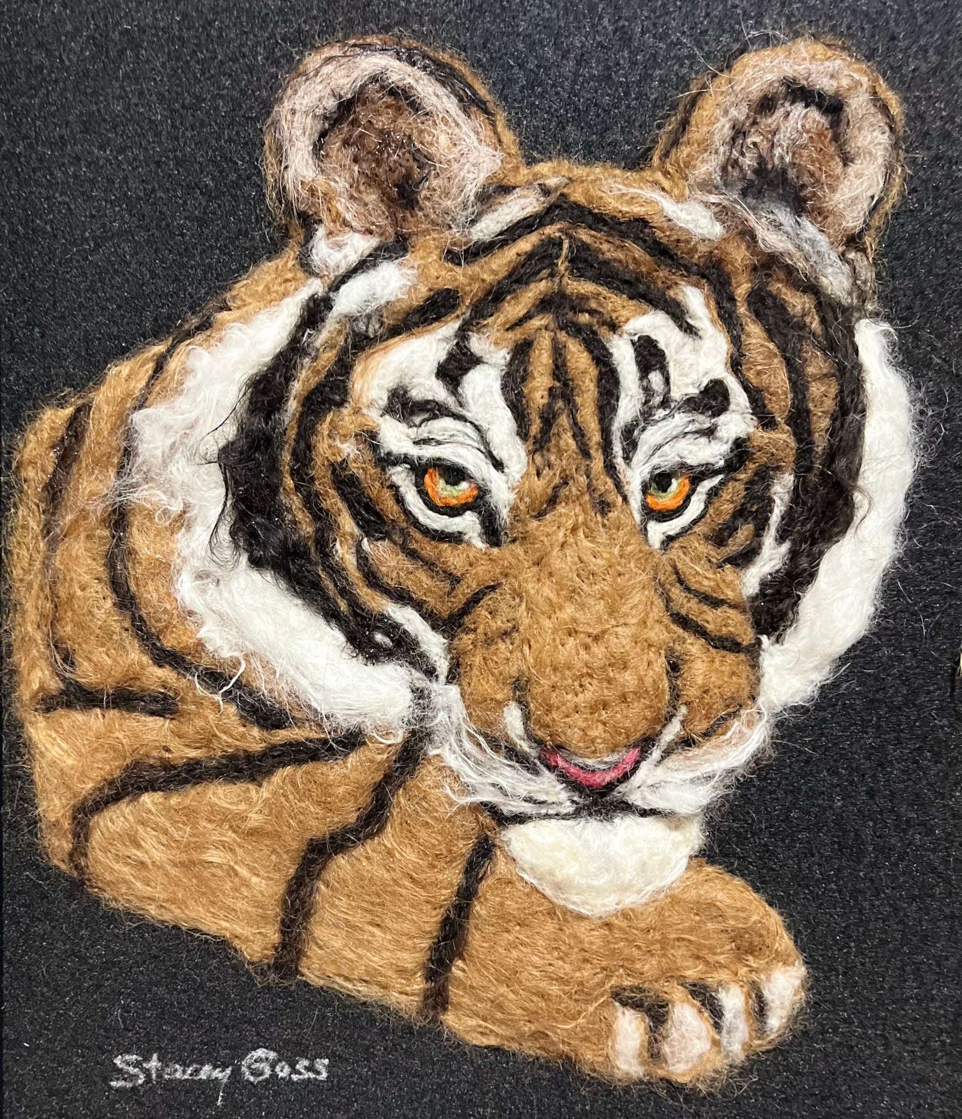 I created this lion-tiger portrait using natural grey, fawn, white, and black fiber (only the eyes are from dyed roving). The piece is mounted on a black felt fabric background inside a black frame (there is no glass).