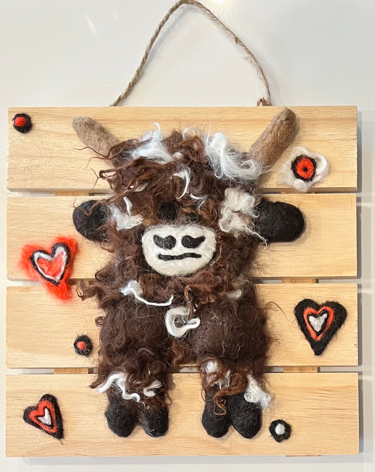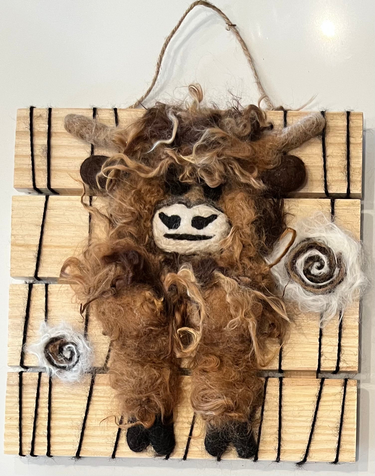 These hanging Highland Cow portraits feature 100% natural Suri Alpaca fiber from my own farm-raised herd. Also check out my 8x8" Highland Cow and Suri Alpaca portraits mounted on wood slat frames. It's all about the bangs!